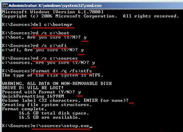 3、清理啟動文件:為避免裝Win7 時啟動文件混亂導致失敗,務必刪除原來拷貝到C盤的bootmgr文件和boot、efi、sources文件夾。分別在命令行窗口鍵入命令并按回車: