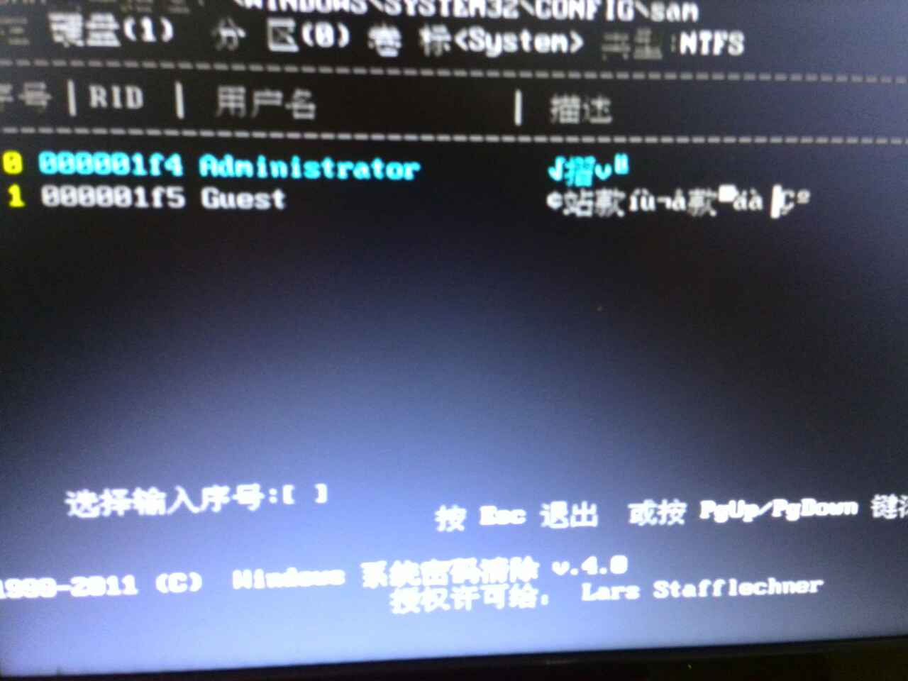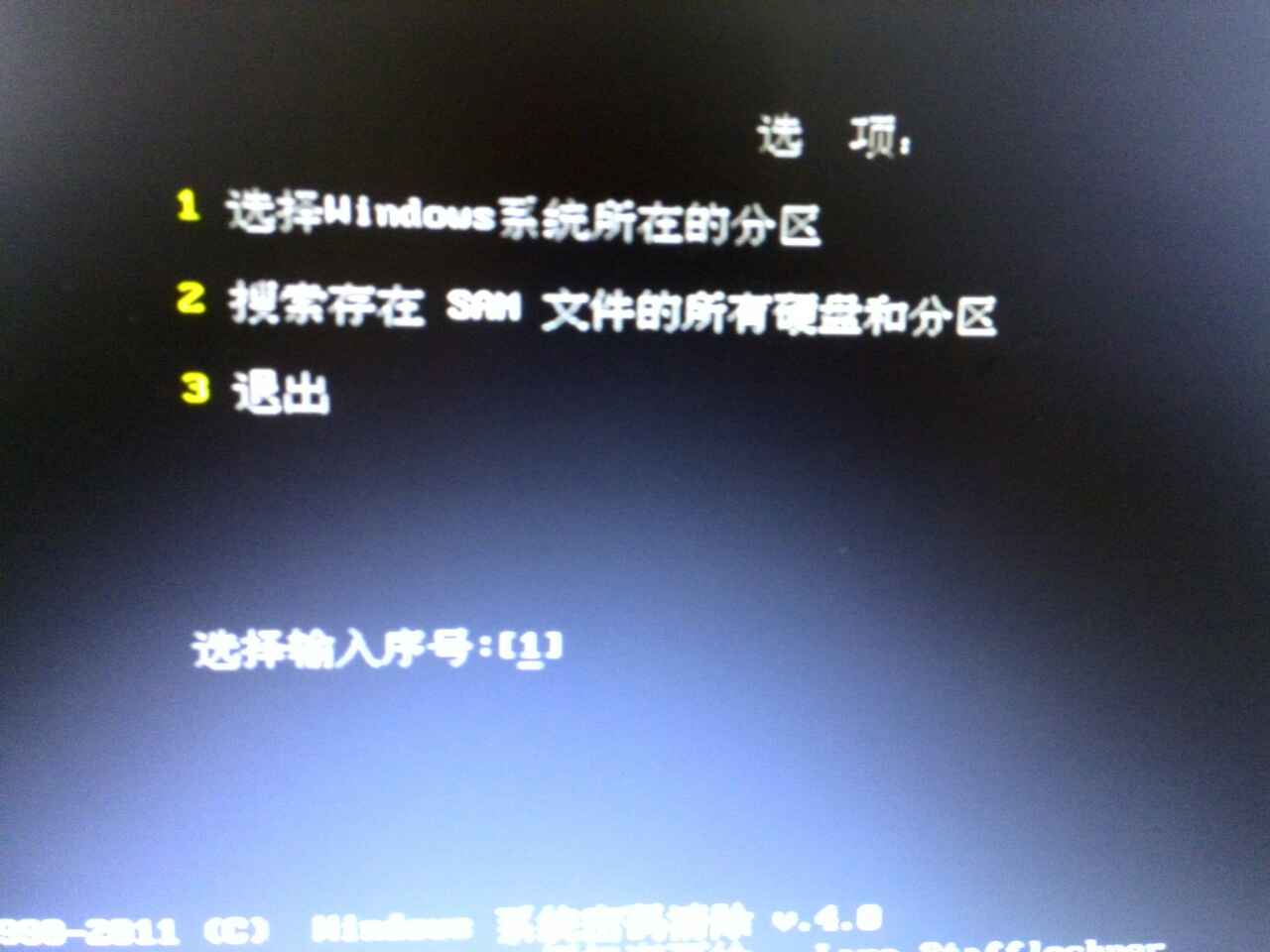第五步、接下來選擇密碼所在的磁盤也就是C盤,判斷依據為看后面顯示的磁盤大小,大概記得你C盤有多大就行了,我這里選擇1,回車后系統自動搜索賬戶密碼;