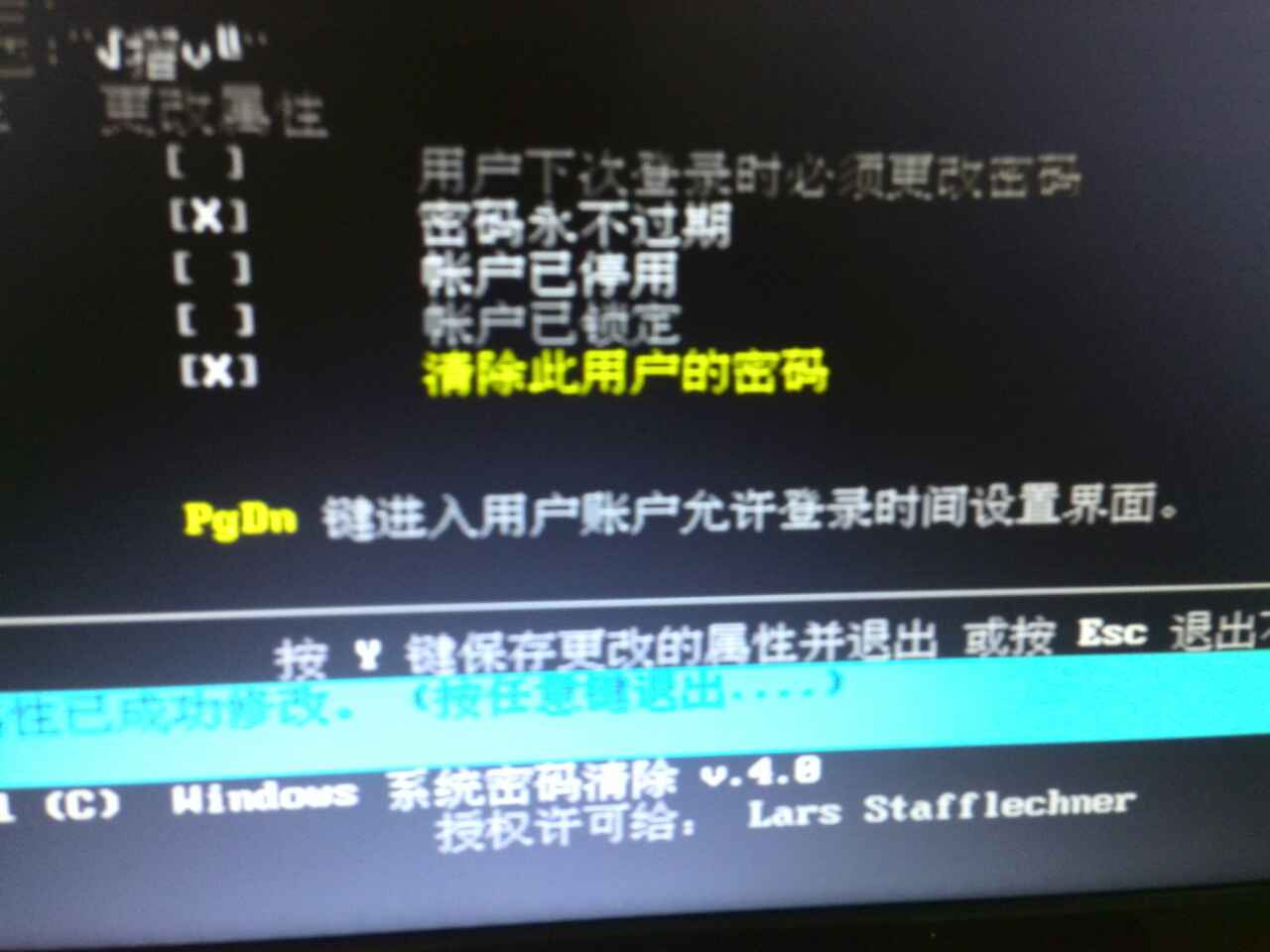 第七步、接下來工具開始執行密碼清除步驟,完了一直按“Esc"退出,重啟后即可正常進入系統了。