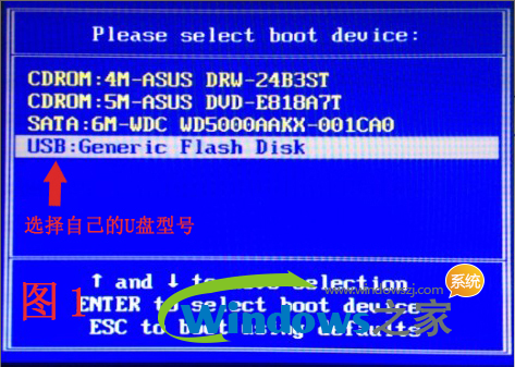 1、重啟系統按鍵盤上的啟動熱鍵會出現BIOS快捷啟動提示框。在窗口中會有幾個選擇,通過鍵盤上的上下方向鍵“↑↓”選擇到您的啟動U盤,然后按回車鍵進入系統之家PE主界面!(一 般我們選擇的時候可以看下其中一個選項是有關USB或者您U盤的品牌的英文名稱,那就是您制作的啟動U盤了!)