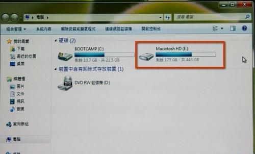 安裝完驅動程序重新開機后,你就會看到在我的電腦里,出現Mac的分區,如下圖紅框中的”Macintosh HD”~這樣你就可以在windows下共享Mac端的文件了~不過很可惜的是,也是只能讀取,不能寫入阿,也許是為了安全性的考量囉!