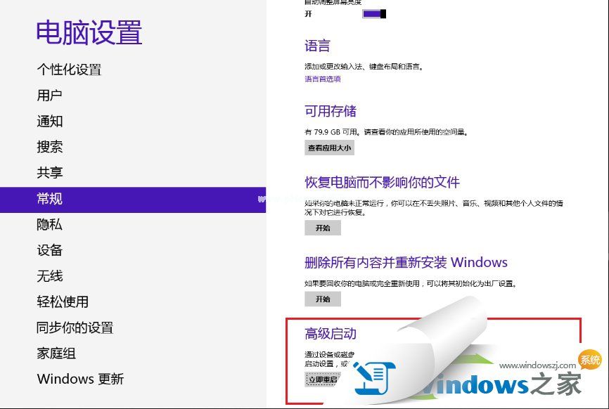 選擇左側"常規(General)"選項,頁面下拉并選擇"高級啟動(Advanced startup)".