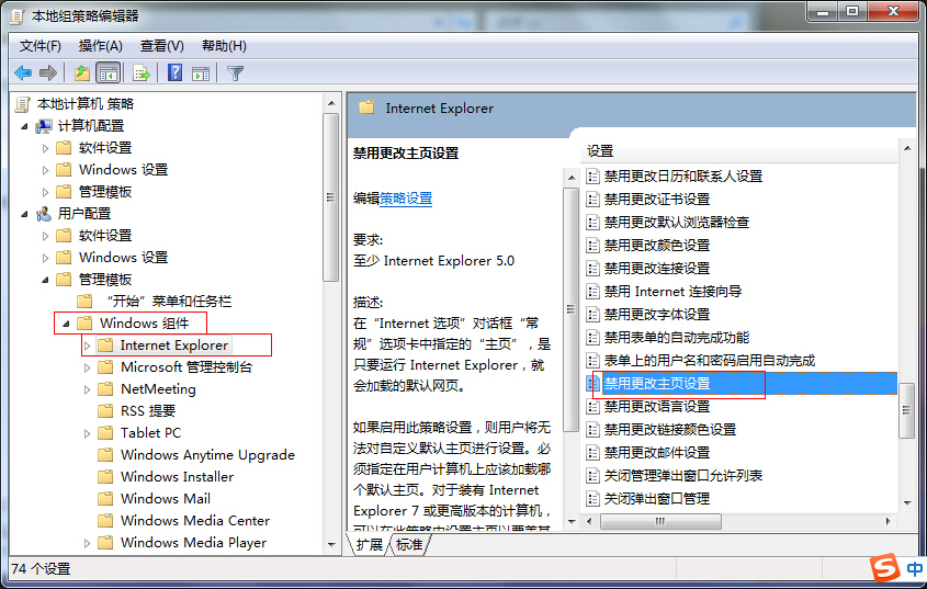 3.在管理模板里依次找到“Windows 組件”和“internet explorer”,然后在右邊找到“禁用更改主頁設置”,雙擊打開。更多精彩內容推薦:怎么重裝系統xp。