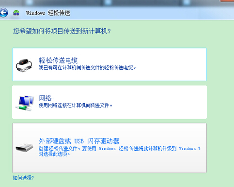 點擊“下一步”,可以看到傳送項目的選擇。三個選項,如果兩臺電腦已經用網線相連,可以選擇“輕松傳送電纜”,如果是通過局域網傳送就選擇“網絡”,如果是只有一臺電腦,則選擇“外部硬盤或USB閃存驅動器”。