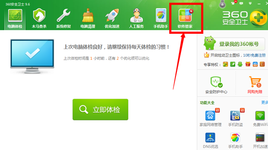 3、使用第三方軟件來強力刪除,比如360安全衛士或者是電腦安全管家等等,拿360安全衛士來說。雙擊進入360安全衛士頁面,在上方可以看到軟件管家,點擊它進入;
