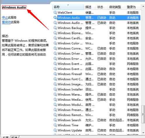 在服務的頁面中間列表找到“Windows Audio”。這里要注意列表中有兩個同樣的“Windows Audio”和一個“Windows AudioEndpointBuilder”選項,所以要看清楚有沒有選錯。更多精彩教程推薦:如何重裝系統win7。