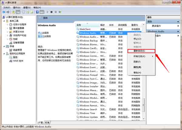 在“Windows Audio”右鍵它,彈出選項選擇重新啟動。