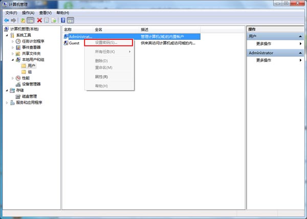 2、桌面計算機右鍵彈出菜單選擇“管理”;在計算機管理頁面左側可以看到“本地用戶和組”雙擊它,接著打開“用戶”;在中間的界面名稱“Administrator”右鍵彈出菜單點擊“設置密碼”回車鍵或者繼續。在設置密碼提示框輸入"000"確定,電腦在開機就不會有開機密碼了。