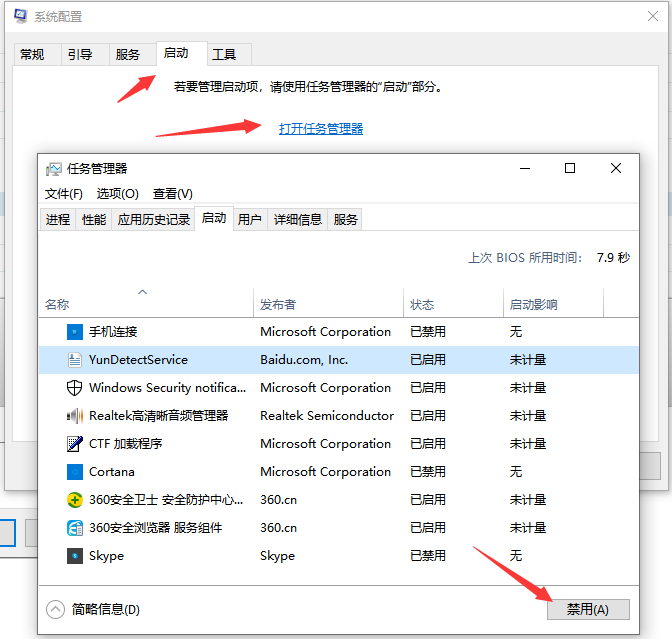 3.之后切換到“啟動”選項,選擇任務管理器,選擇列表中的全部項目,再點擊“禁用”,然后關閉任務管理器并重啟計算機即可。