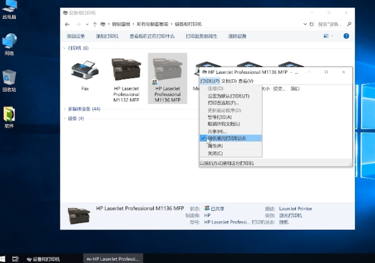 3、在工作窗口中點擊打印機,取消勾選脫機使用打印機即可