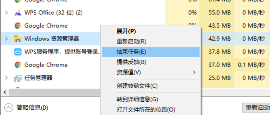 2、打開任務管理器后切換到進程選項,找到explorer.exe進程,右鍵點擊頁面中的“結束進程”按鈕結束進程操作。(win10系統的叫做“windows資源管理器”)
