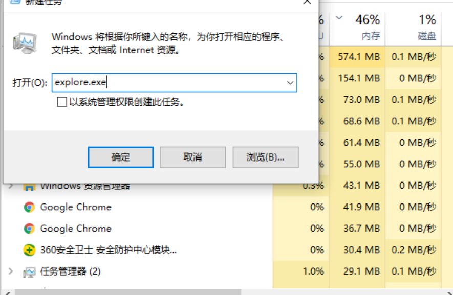 3、然后點擊文件-運行新任務,重新輸入explore.exe點擊確定重啟資源管理器看是否解決黑屏問題。