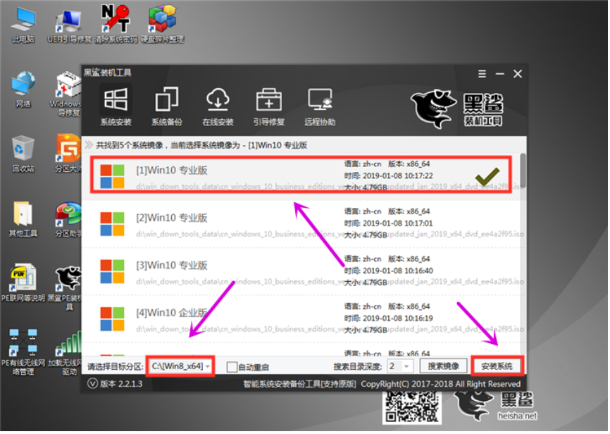 5.當電腦進入PE界面之后,會自動彈出黑鯊裝機工具。如果沒有彈出,可以通過桌面快捷方式打開。打開后,選擇U盤內的系統安裝到分區,點擊安裝系統,即可開始系統安裝操作。