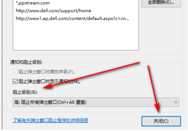 5、根據實際情況選擇要阻止的級別,然后點擊關閉。