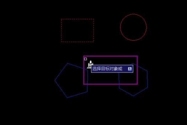 3:接下來就按【enter】,選擇【對象】,比如現在需要把藍色的正五邊形刷成紅色圖層,這個對象就選擇紅色,紅色的就會變成虛線,如下圖所示!