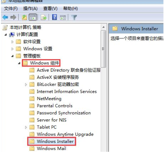 5.進入頁面后,我們在本地組策略編輯器中依次展開”計算機配置“—”管理模板“—”windows組件“,在其下找到并選中windows installer。