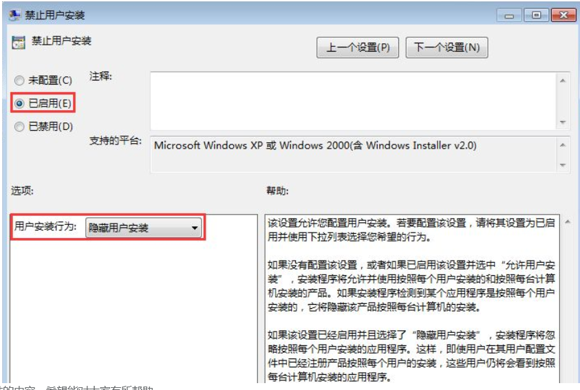 9.最后在打開的窗口中勾選已啟用,下方用戶安裝行為中選中”隱藏用戶安裝“設置完成后點擊確定。