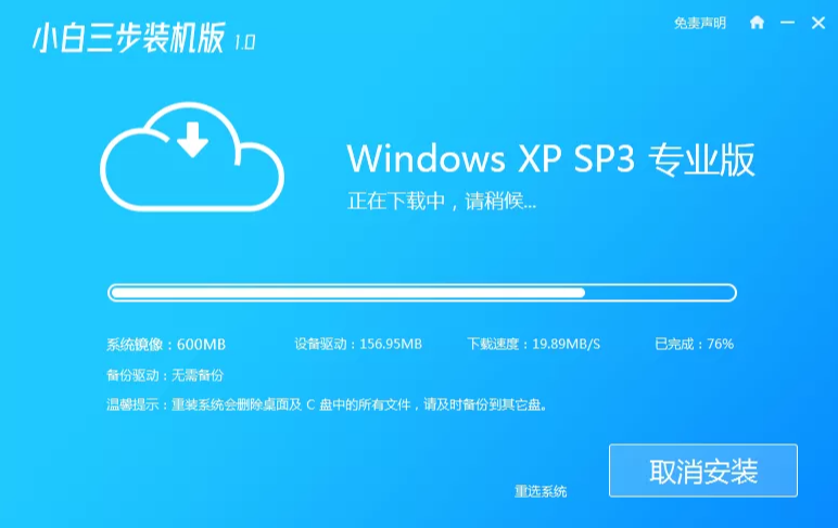 2、選擇想要安裝的系統之后,小白三步裝機版軟件將會自動下載并安裝,我們只需要耐心等待,不需要其它操作。