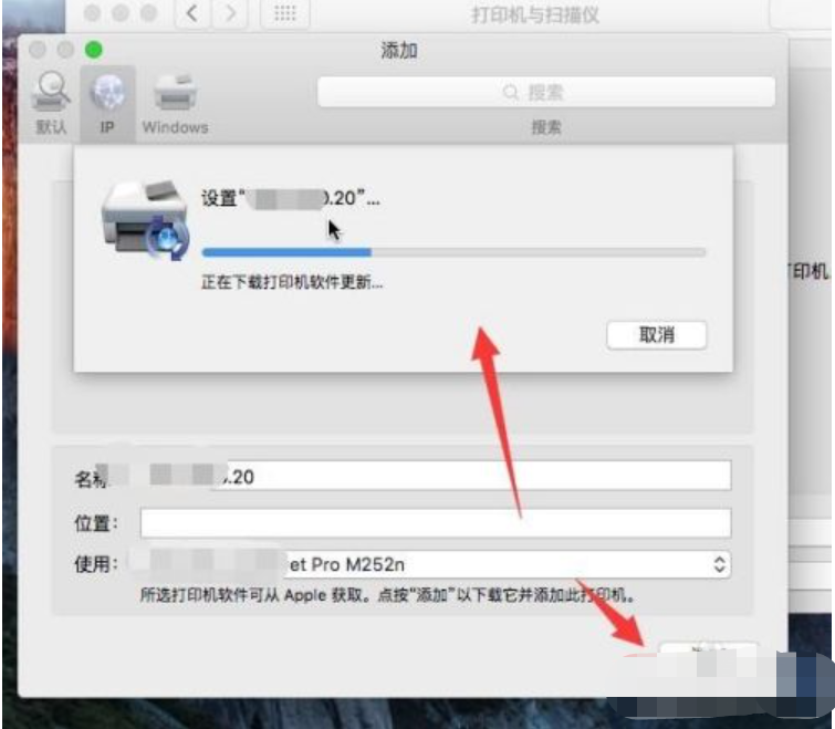3、輸入IP地址,搜索打印機狀態,顯示出打印機名稱,點擊添加按鈕,下載安裝打印機驅動。