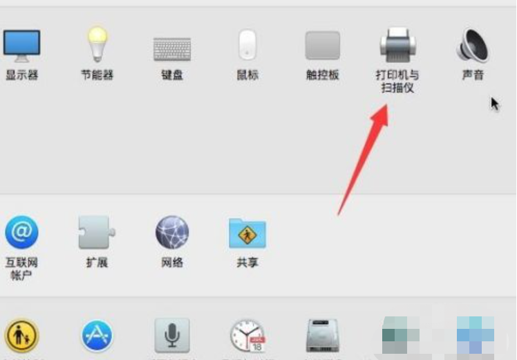 2、進入 偏好設置界面,找到并打開【打印機與掃描儀】圖標。