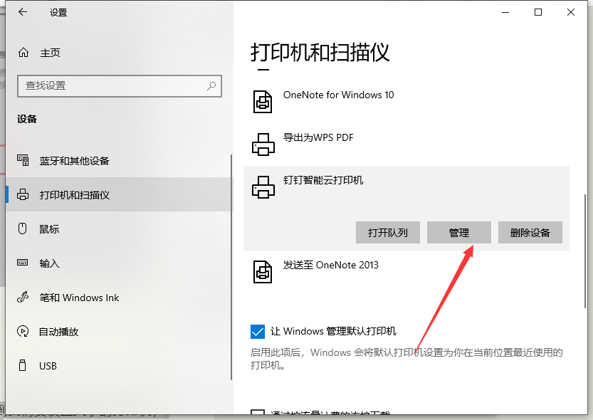 4.找到你的打印機的名稱,并點擊打印機,再點擊【管理】。