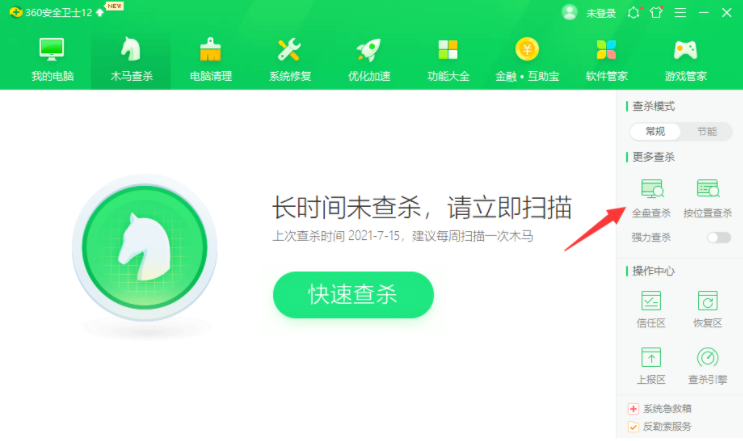 使用第三方殺毒工具查殺病毒、木馬時,一定要選擇“全盤查殺”,有些病毒和木馬會隱藏在其他磁盤空間內,不全盤查殺的話,還會定期發作。