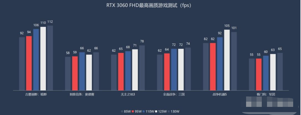 2、RTX 3060顯卡不同功耗版本的性能差距:2022年的游戲本主流顯卡依舊是RTX 3060,同樣的顯卡存在多個功耗版本,比如130W的滿血版,95W的殘血版等,選擇搭載RTX 3060顯卡的游戲本的時候,建議同時了解一下功耗。由于不同游戲本的散熱能力、單雙面內存顆粒、是否支持獨顯直連等因素影響,實際的游戲本性能表現會有些出入,以下數據僅供參考。