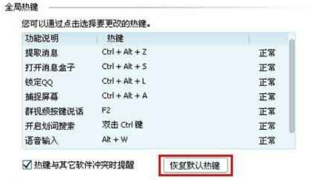 4、要是想用默認的ctrl+atl+A組合鍵作為QQ截圖的快捷鍵,可以選擇“恢復默認熱鍵”。