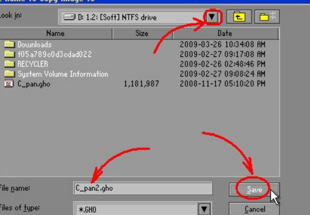 5、此時彈出存儲位置對話框,單擊黑三角按鈕,在下拉列表中選擇要存儲鏡像文件的分區(注意:要確保該分區有足夠的存儲空間),進入相應的文件夾(注意:要記準存放鏡像文件的文件夾,否則恢復系統時將難以找到它),在“File name”(意為:文件名)處輸入鏡像文件的文件名,輸好文件名后,單擊“Save”(意為:保存)按鈕繼續操作。