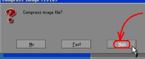 7、出現“是否壓縮鏡像文件”選項,如下圖。有“No(不壓縮)、Fast(快速壓縮)、High(高壓縮比壓縮)”三個選項,壓縮比越低,備份速度越快,但占用磁盤空間越大;壓縮比越高,備份速度越慢,但占用磁盤空間越小。一般選“High”以節省磁盤存儲空間,低配置機器或想節省時間可以選擇“Fast”或“No”。