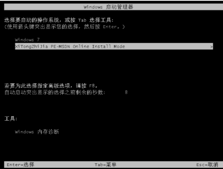 4.計算機重啟后,進入啟動選項界面,選擇帶有光標的選項進入pe系統。