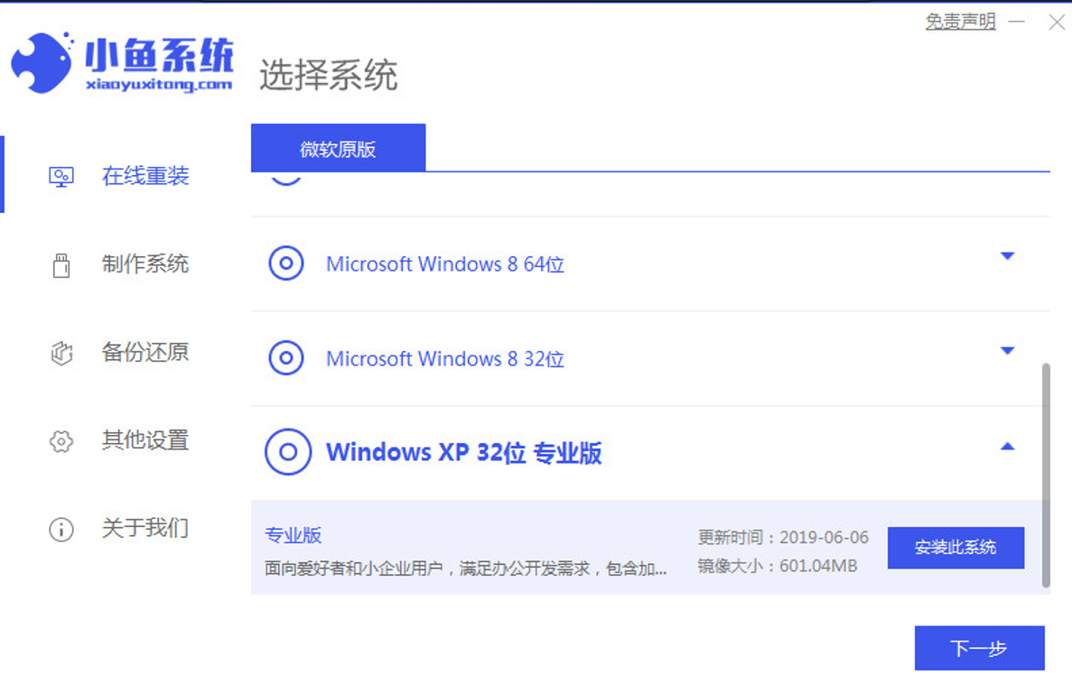 1、下載安裝小魚系統工具,選擇win xp系統,點擊“安裝此系統”。