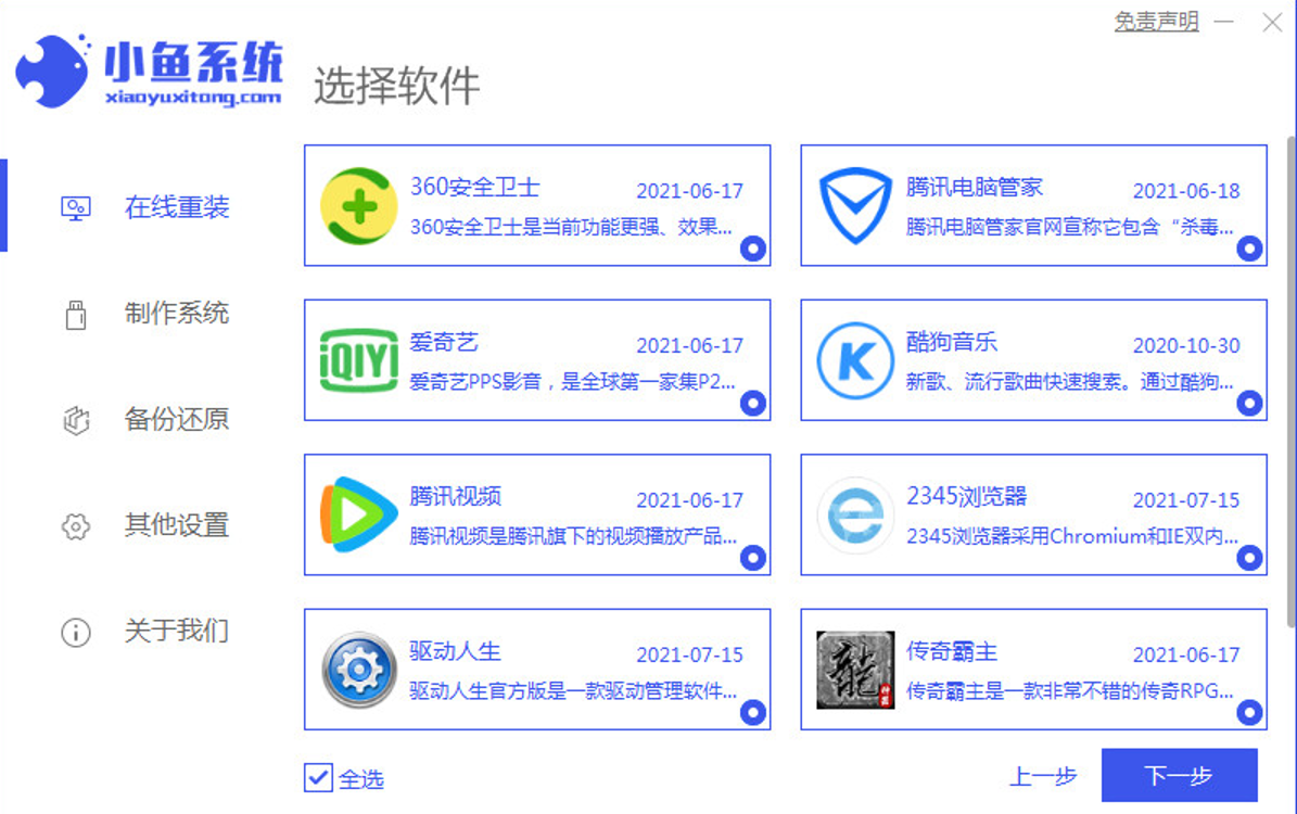1、下載安裝小魚系統工具,選擇win xp系統,點擊“安裝此系統”選擇要安裝的應用軟件,點擊下一步。