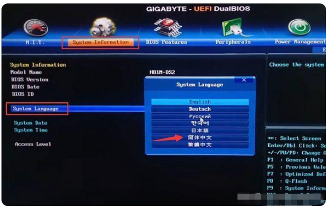 2.然后選擇“Susten Infornation”,再尋找“Systen Language”,按回車鍵,隨后選擇“簡體字中文”。
