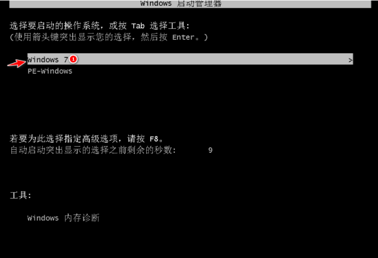 9、重啟電腦后在啟動菜單中選擇 Windows 7 系統進系統。
