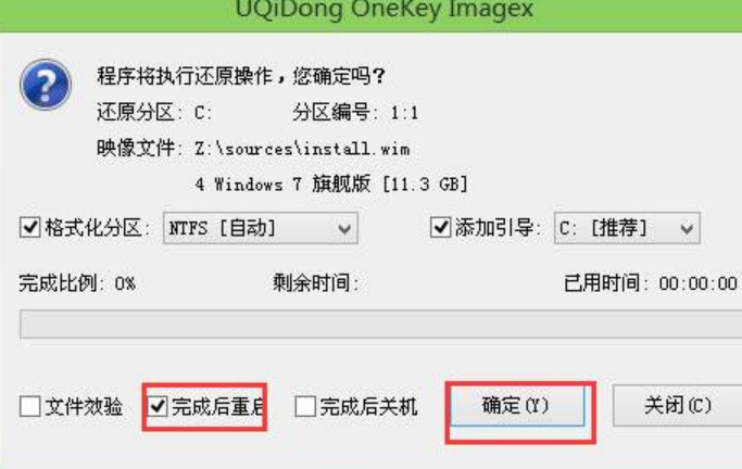 3、彈出程序將執行還原操作提醒框,勾選完成后重啟復選框,點擊確定按鈕,如圖: