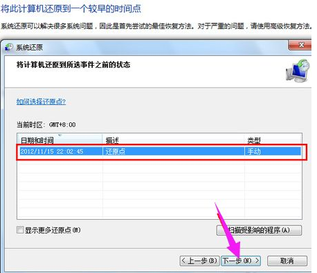 5.在系統還原點的選項當中,選擇一個還原點,要確保所選擇的還原點是之前系統正常時的還原點,因為如果是不正常的還原點則會出現問題。