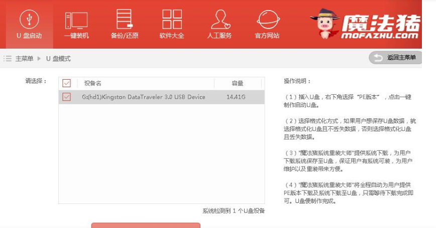 1.把U盤插到電腦USB接口,運行魔法豬系統重裝大師軟件,切換到U盤啟動——點擊U盤模式。