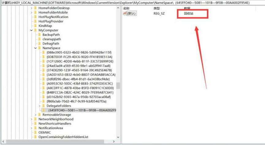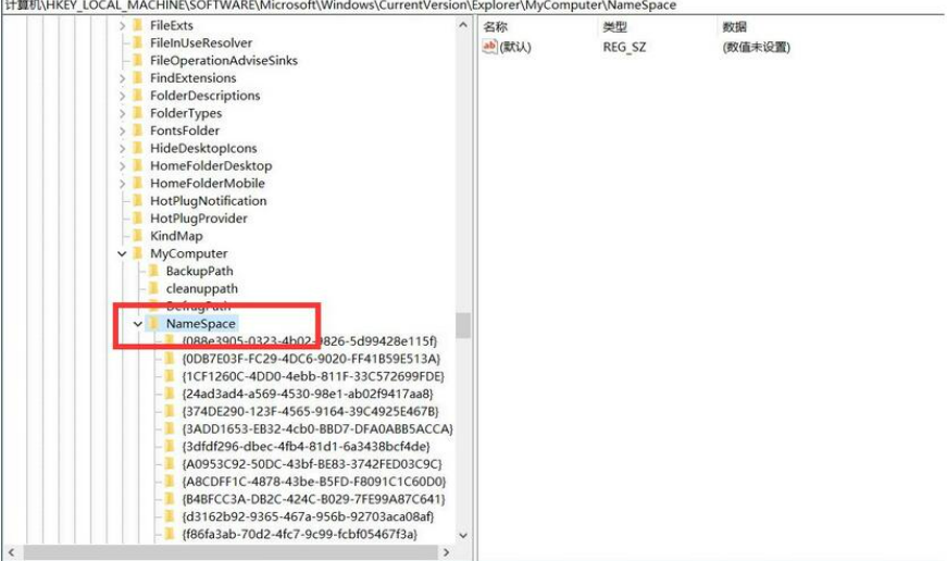 2、打開注冊表編輯器后,按照路徑(計算機/HKEY_LOCAL_MACHINE/SOFTWARE/Microsoft/Windows/CurrentVersion/Explorer/MyComputer/NameSpace)依次點擊展開,找到“NameSpace”文件夾。
