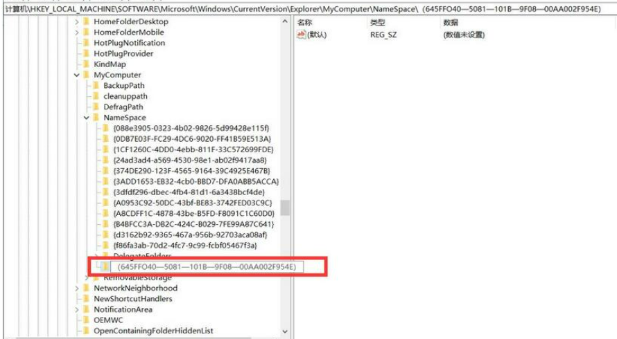3、然后選中文件夾,右擊新建“項”,將項名稱命名為這串字符(645FFO40—5081—101B—9F08—00AA002F954E)。