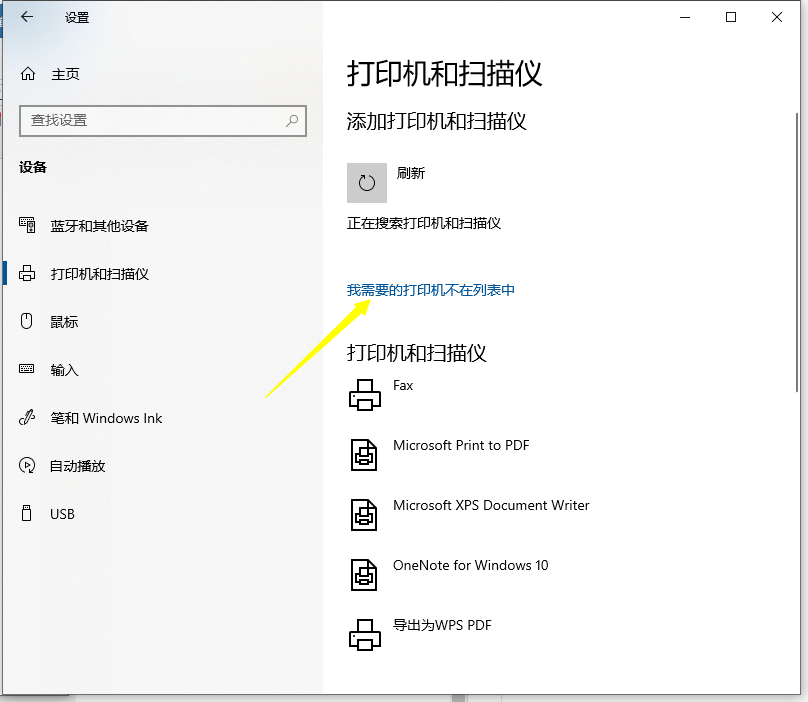 4、默認會自動搜索已連接打印機,若長時間未找到,可選“我所需的打印機未列出”。