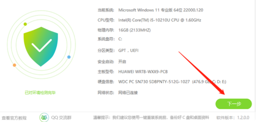 1、進入工具后,工具會自動檢測當前電腦系統的相關信息,點擊下一步。