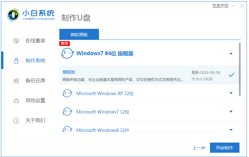 1、首先到小白系統官網下載安裝小白一鍵重裝系統軟件打開,u盤插入電腦。關掉防病毒軟件,點擊界面左邊的“制作系統”,點擊下一個步驟開始。