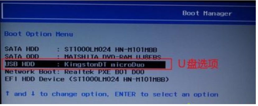 3、然后會跳出啟動項選擇菜單,以下圖為例,DVD表示光盤,USB KEY表示U盤,選擇一項,按回車,就可以進入光盤或U盤重裝界面;