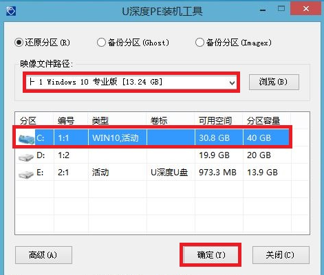 2、在u深度pe一鍵裝機工具窗口中,點擊“瀏覽”將原版系統安裝包添加進來,在磁盤列表中選擇c盤作為系統盤,點擊確定即可。