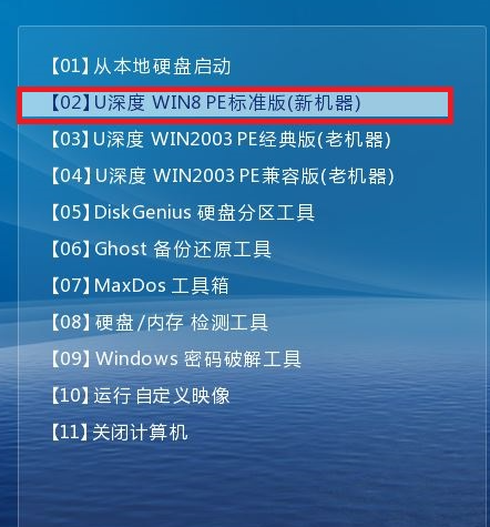 1、首先我們把制作好的u盤啟動盤插入電腦usb接口,接著重啟電腦,進入u深度菜單頁面,然后選取“【02】U深度Win8PE標準版(新機器)”選項,按下回車鍵確認。