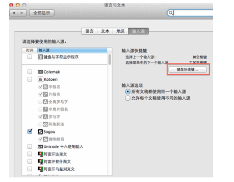 三、在打開的"語言與文本對話框中,選擇輸入源選項卡,點擊右側的鍵盤快捷鍵設置