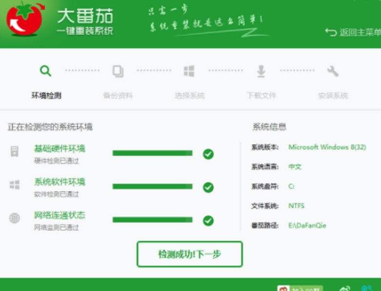 安裝大番茄一鍵重裝系統軟件,點擊“立即重裝系統”進入環境檢測;
