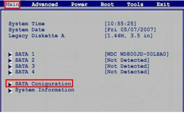 1、進入華碩的BIOS,選擇Main選項,選擇SATA Coniguration按Enter進入子項。