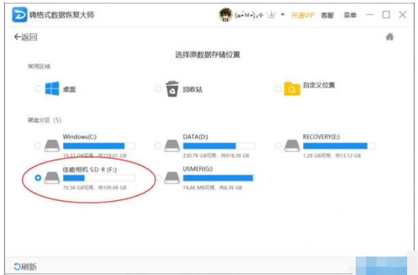 4、擇原數據存儲位置區域,在這里我們勾選識別出的SD卡后再點擊右下角的“開始掃描”;